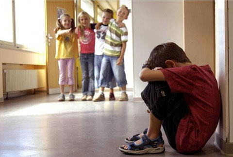 (Описание изображение: Светлокожий темноволосый мальчик в черных брюках и красной футболки сидит, уткнувшись лицом в свои колени. В конце школьного коридора, в котором он сидит, стоят четверо других детей: они стоят вместе и смеются над ним).