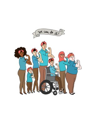 | 7 женщин разного пола, возраста, расы и телосложения. Одна из женщин сидит в инвалидной коляске. Еще на одной надет хиджаб. Источник |